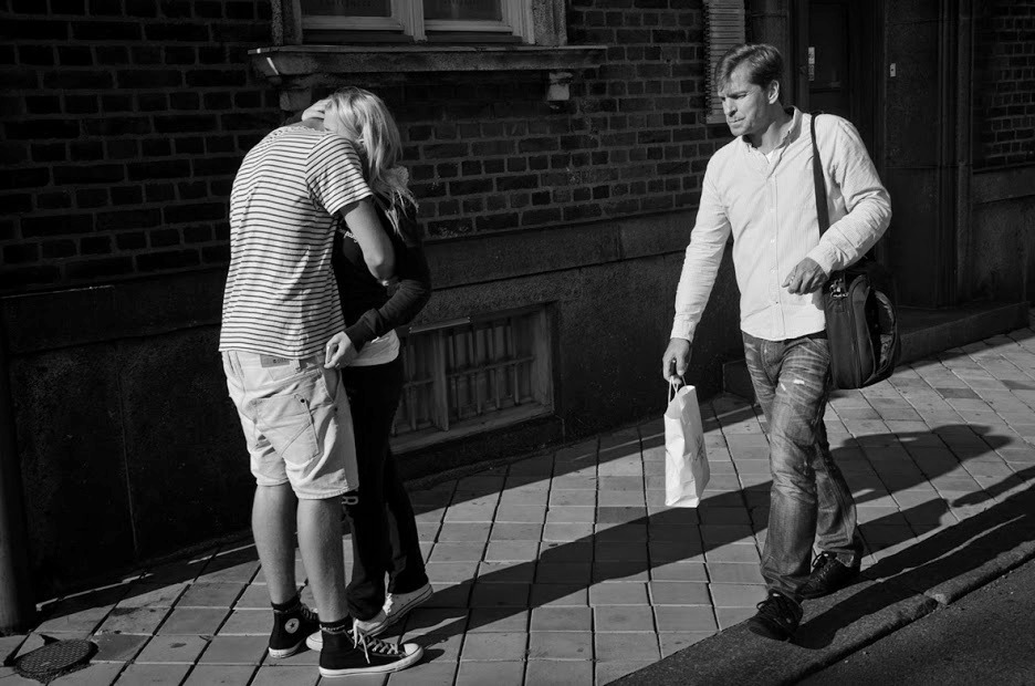 Längst ner ser jag några ungdomar. När jag kommer närmare börjar ett par att kyssas. Men det är en tråkig omgivning. Ingen bild.
